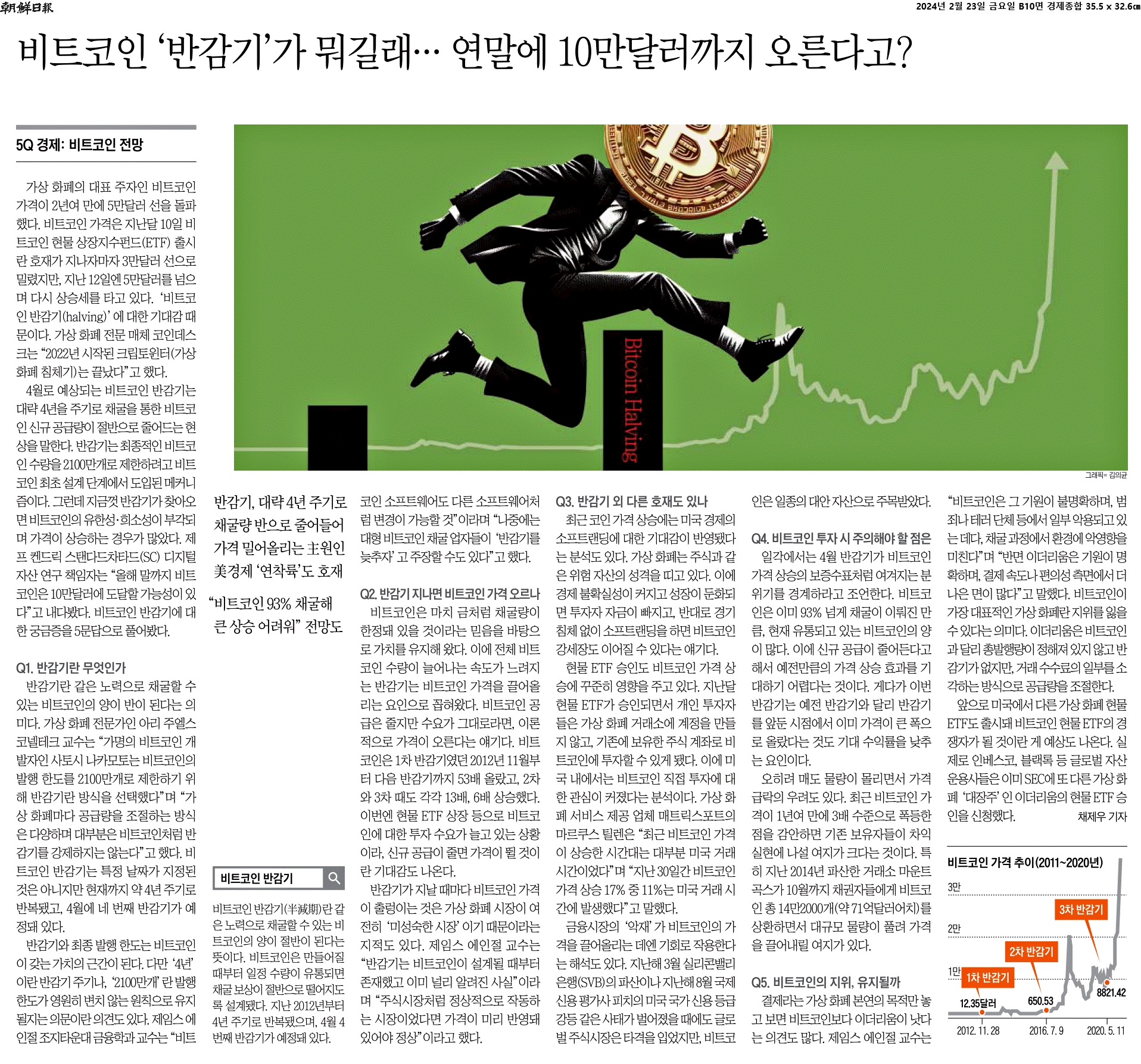 ④ 비트코인은 이미 93% 넘게 채굴이 이뤄진 만큼, 현재 유통되고 있는 비트코인의 양이 많다. 이에 신규 공급이 줄어든다고 해서 예전만큼의 가격 상승 효과를 기대하기 어렵다는 것이다. 게다가 이번 반감기는 예전 반감기와 달리 반감기를 앞둔 시점에서 이미 가격이 큰 폭으로 올랐다는 것도 기대 수익률을 낮추는 요인이다.