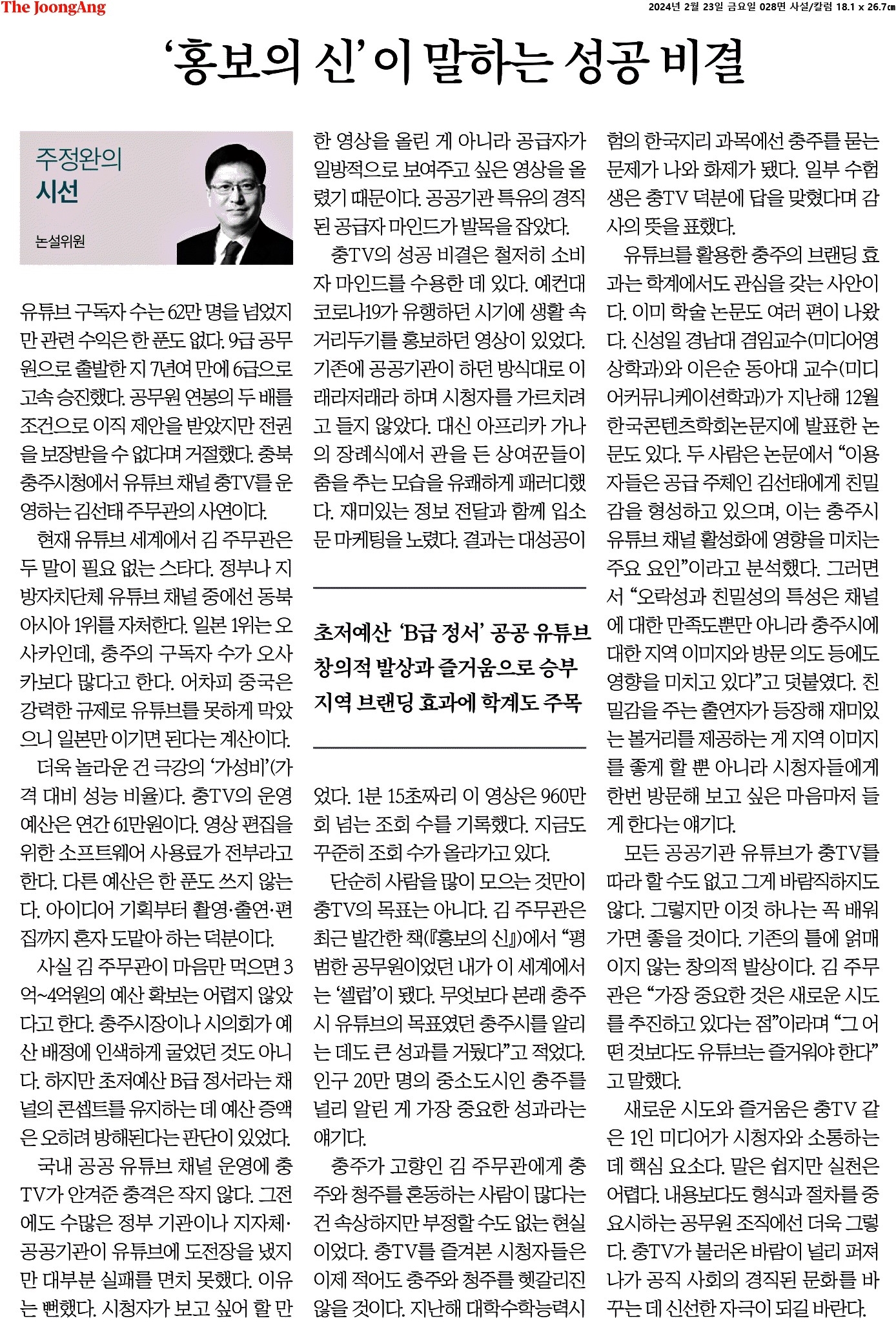 ① 정부나 지방자치단체 유튜브 채널 중에선 동북아시아 1위를 자처한다. 일본 1위는 오사카인데, 충주의 구독자 수가 오사카보다 많다고 한다.