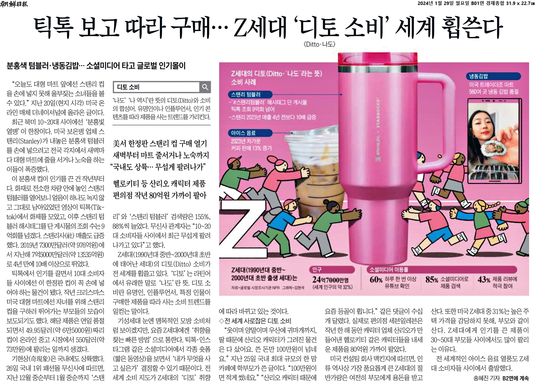 ④ Z세대(1990년대 중반~2000년대 초반에 태어난 세대)의 디토(Ditto) 소비가 전 세계를 휩쓸고 있다. ‘디토’는 라틴어에서 유래한 말로 ‘나도’란 뜻. 디토 소비란 유명인, 인플루언서, 특정 인물이 구매한 제품을 따라 사는 소비 트렌드를 일컫는 말이다.