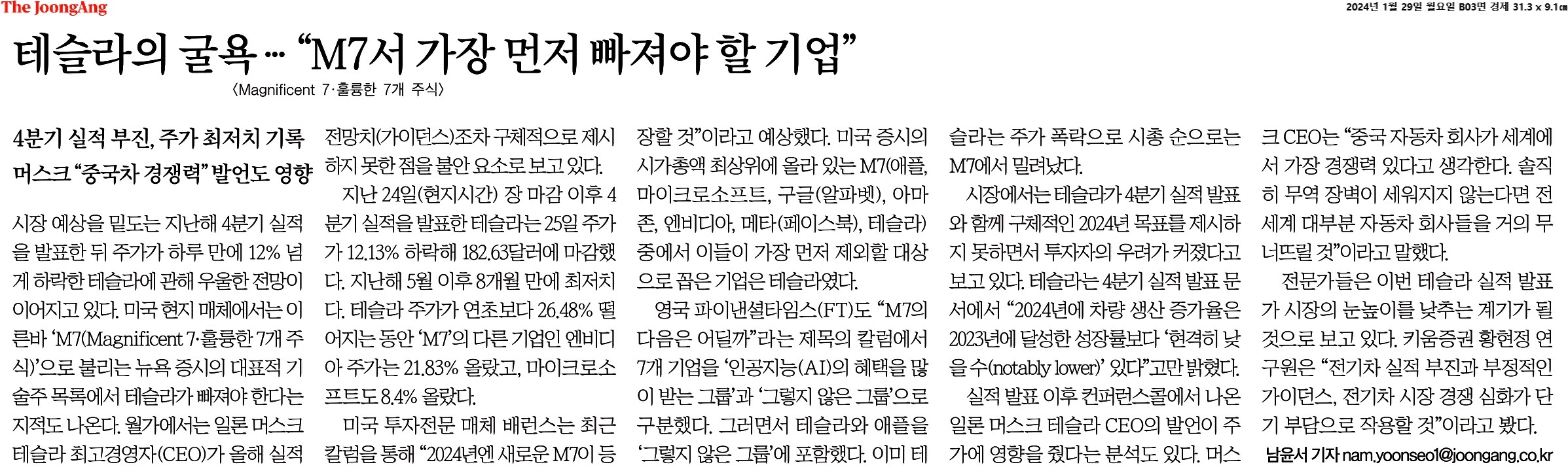 ③ “2023년처럼 M7의 특별한 한 해는 되풀이되기 매우 어려울 것”이라며 “2024년엔 새로운 M7이 등장할 것”이라고 예상했다. 미국 증시의 시가총액 최상위에 올라 있는 M7(애플, 마이크로소프트, 구글(알파벳), 아마존, 엔비디아, 메타(페이스북), 테슬라) 중에서 이들이 가장 먼저 제외할 대상으로 꼽은 기업은 테슬라였다.