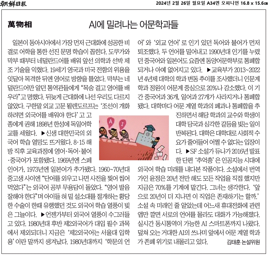 ③ 교육부가 2013~2022년 4년제 대학의 학과 변동 추이를 조사했더니 인문계 학과 정원이 어문계 중심으로 20%나 감소했다.