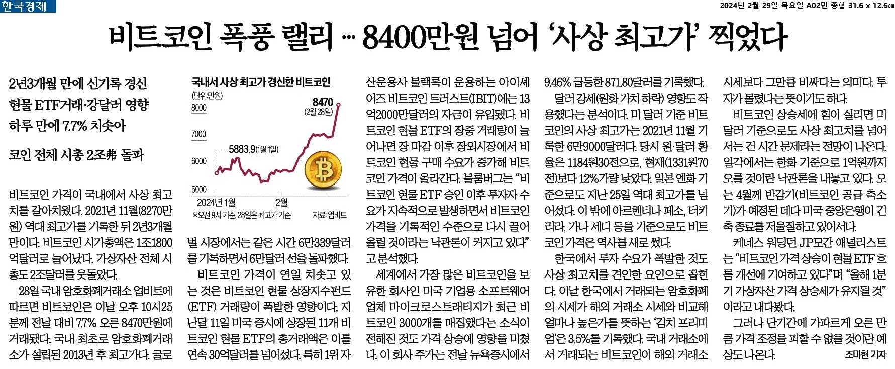 ① 비트코인 가격이 국내에서 사상 최고치를 갈아치웠다. 2021년 11월(8270만원) 역대 최고가를 기록한 뒤 2년3개월 만이다. 비트코인 시가총액은 1조1800억달러로 늘어났다. 가상자산 전체 시총도 2조달러를 웃돌았다.