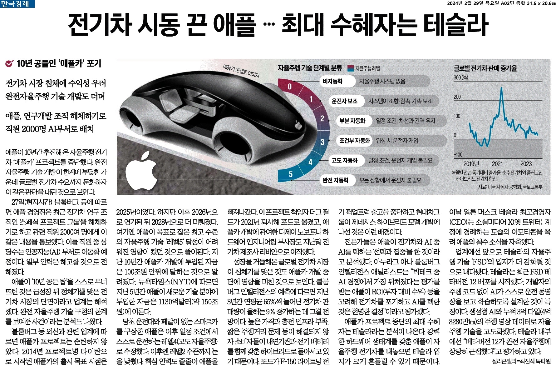 ① 애플이 10년간 추진해 온 자율주행 전기차 ‘애플카’ 프로젝트를 중단했다. 완전 자율주행 기술 개발이 한계에 부딪힌 가운데 글로벌 전기차 수요까지 둔화하자 이 같은 판단을 내린 것으로 보인다.