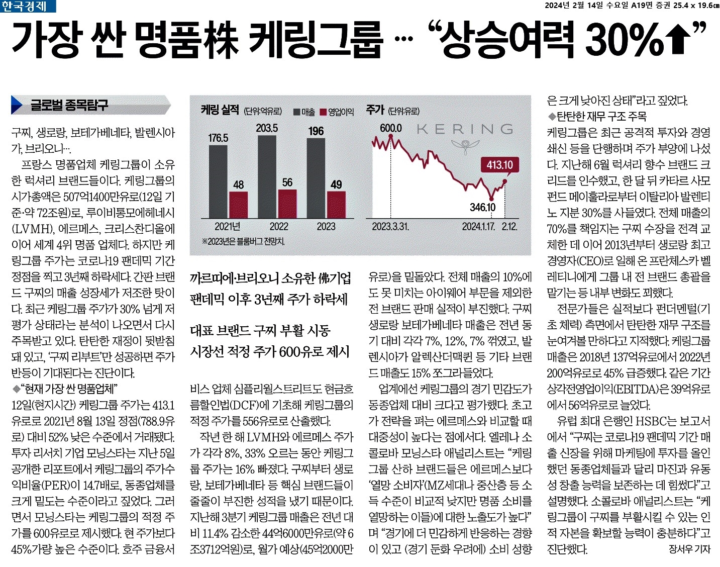 ③ 작년 한 해 LVMH와 에르메스 주가가 각각 8%, 33% 오르는 동안 케링그룹 주가는 16% 빠졌다. 구찌부터 생로랑, 보테가베네타 등 핵심 브랜드들이 줄줄이 부진한 성적을 냈기 때문이다. 업계에선 케링그룹의 경기 민감도가 동종업체 대비 크다고 평가했다. 초고가 전략을 펴는 에르메스와 비교할 때 대중성이 높다는 점에서다.