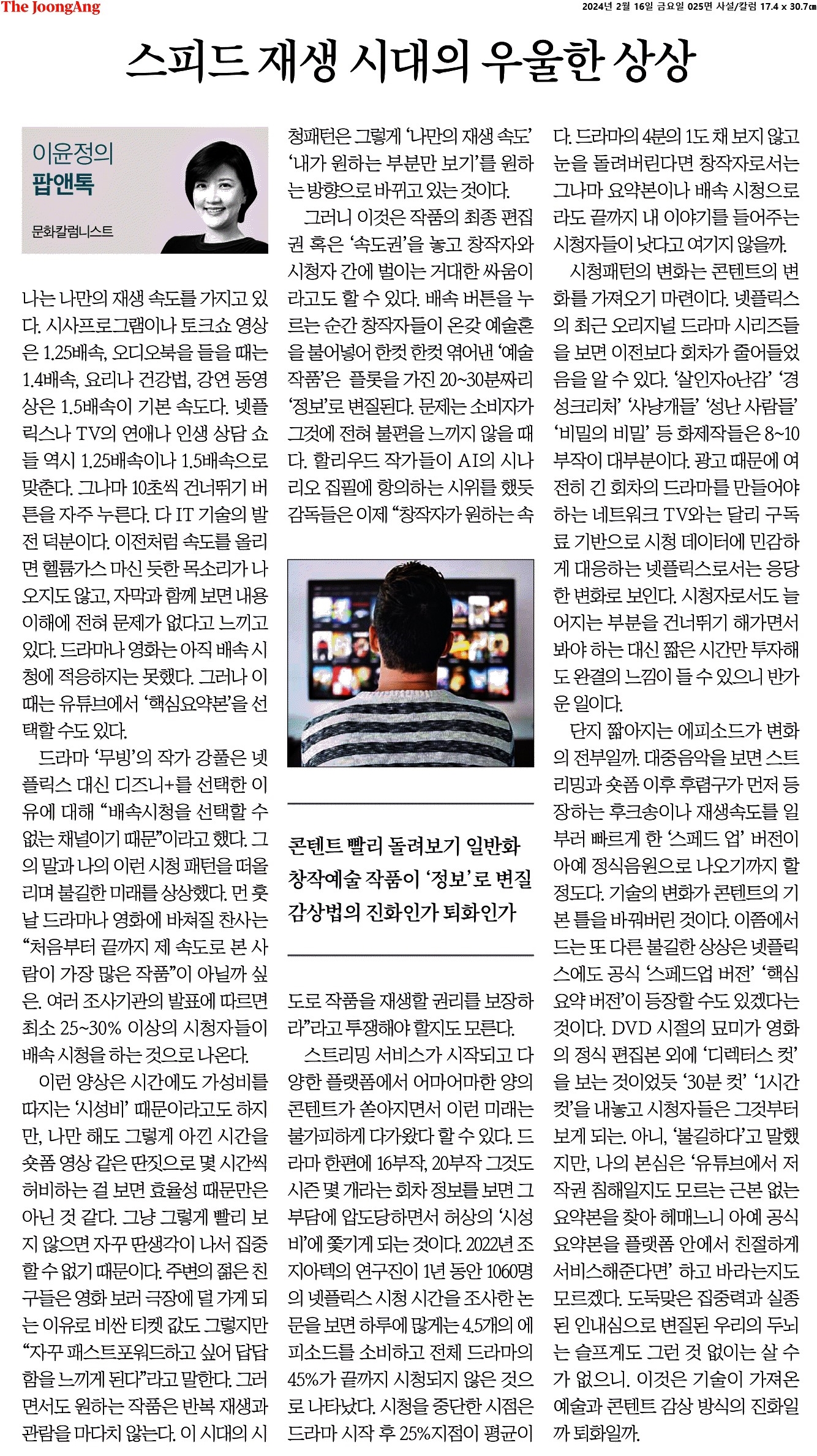 ③ 이 시대의 시청패턴은 그렇게 ‘나만의 재생 속도’ ‘내가 원하는 부분만 보기’를 원하는 방향으로 바뀌고 있는 것이다. 그러니 이것은 작품의 최종 편집권 혹은 ‘속도권’을 놓고 창작자와 시청자 간에 벌이는 거대한 싸움이라고도 할 수 있다.