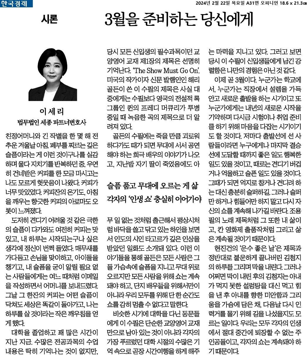 ④ 그때가 되면 억지로 참거나 견디려 하는 대신 충분히 슬퍼하길. 그러나 슬퍼만 하거나 힘들어만 하지 말고 다시 자신의 쇼를 계속해 나가길 바란다. 조용필의 노래 제목처럼 그 또한 내 삶이고, 칸 영화제 출품작처럼 그리고 삶은 계속될 것이기 때문이다.