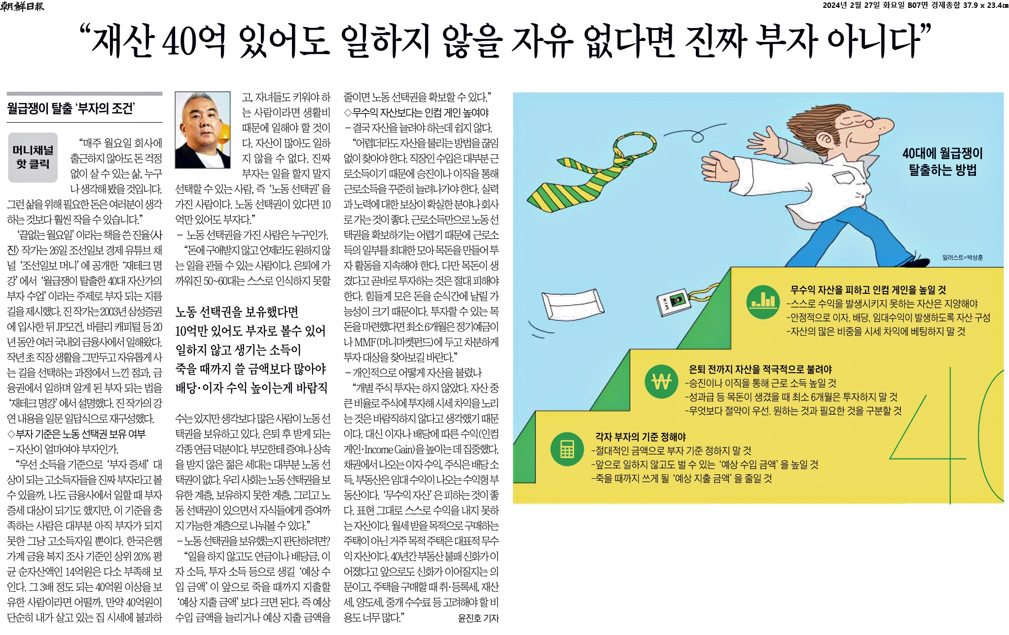 ① 진짜 부자는 일을 할지 말지 선택할 수 있는 사람, 즉 ‘노동 선택권’을 가진 사람이다. 노동 선택권이 있다면 10억만 있어도 부자다. 돈에 구애받지 않고 언제라도 원하지 않는 일을 관둘 수 있는 사람이다.