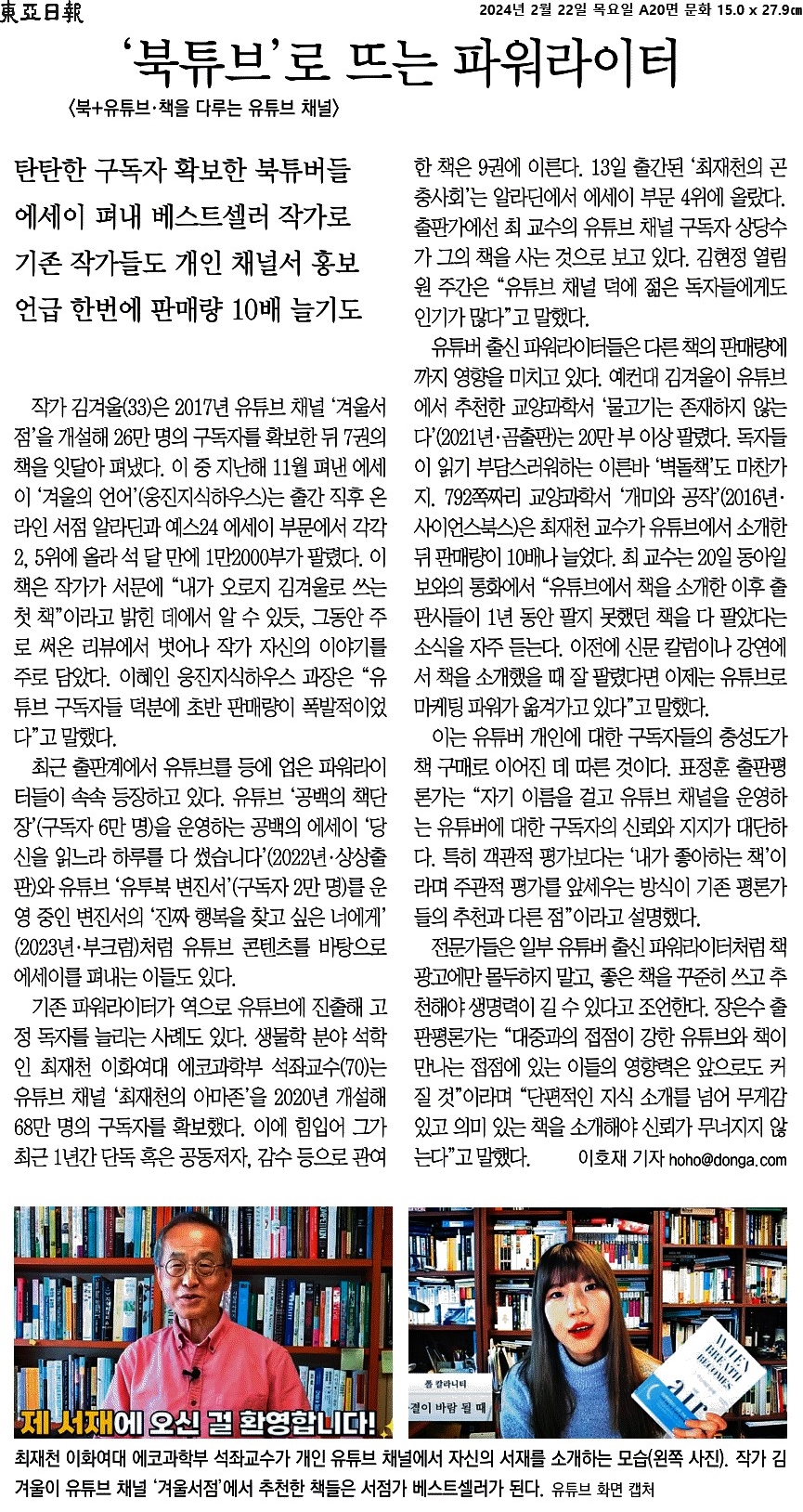① 작가 김겨울(33)은 2017년 유튜브 채널 ‘겨울서점’을 개설해 26만 명의 구독자를 확보한 뒤 7권의 책을 잇달아 펴냈다. 최근 출판계에서 유튜브를 등에 업은 파워라이터들이 속속 등장하고 있다.