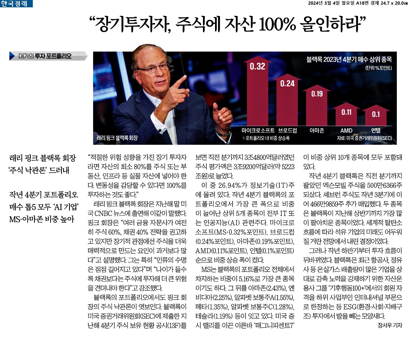 ③ 작년 4분기 블랙록의 포트폴리오에서 가장 큰 폭으로 비중이 늘어난 상위 5개 종목이 전부 IT 또는 인공지능(AI) 관련주다. 마이크로소프트(MS·0.32%포인트), 브로드컴(0.24%포인트), 아마존(0.19%포인트), AMD(0.11%포인트), 인텔(0.1%포인트) 순으로 비중 상승 폭이 컸다.