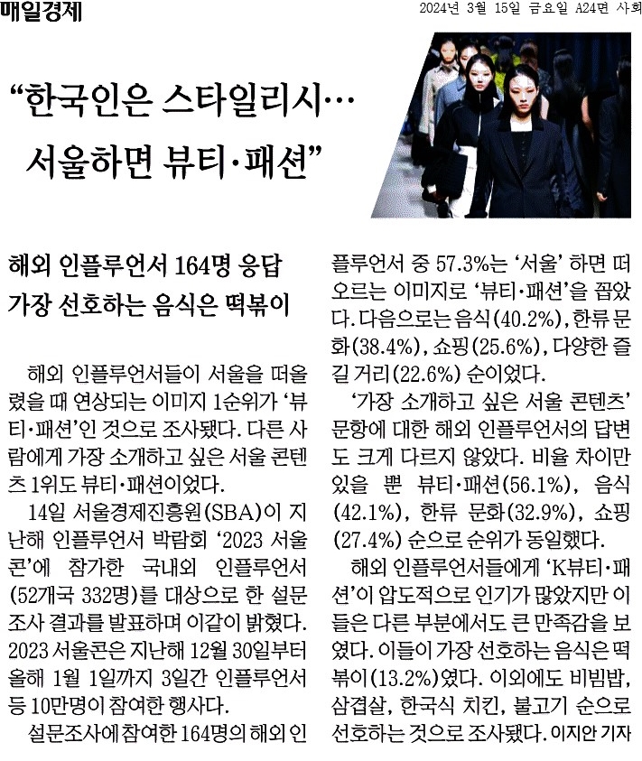 ② 14일 서울경제진흥원(SBA)이 지난해 인플루언서 박람회 '2023 서울콘'에 참가한 국내외 인플루언서(52개국 332명)를 대상으로 한 설문조사 결과를 발표하며 이같이 밝혔다.