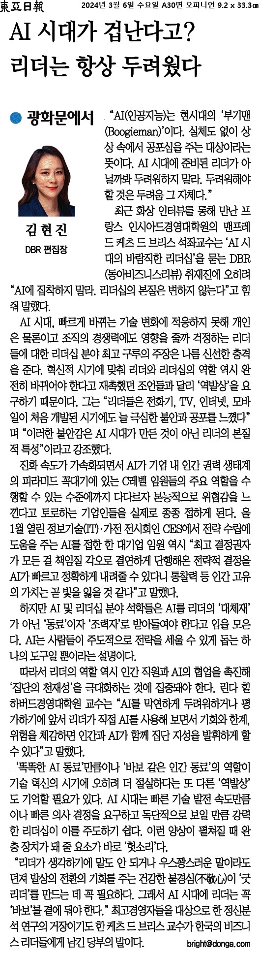 ④ 하지만 AI 및 리더십 분야 석학들은 AI를 리더의 ‘대체재’가 아닌 ‘동료’이자 ‘조력자’로 받아들여야 한다고 입을 모은다. AI는 사람들이 주도적으로 전략을 세울 수 있게 돕는 하나의 도구일 뿐이라는 설명이다.
