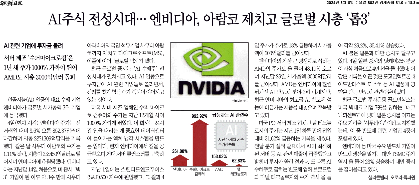 ① 엔비디아가 사우디 아람코를 제치고 세계에서 세번째로 시가총액이 높은 기업이 됐다.