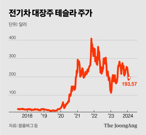 ③ 당분간 전기차 수요 자체가 둔화할 것이란 전망도 이어지다 보니 좀처럼 돌파구를 찾기가 힘들다는 얘기도 나온다. 테슬라는 2021년과 2022년 미국 증시 시총 5위 안에 들었지만 현재는 12위로 밀려났다. 이 때문에 미국 증시의 상승을 이끄는 7개 주요 기업을 뜻하는 ‘매그니피센트7(M7)’ 명단에서 테슬라를 빼야 한다는 목소리도 커졌다.