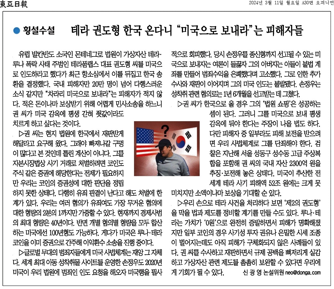 ③ 반면 개별 혐의별 형량을 모두 합산하는 미국에선 100년형도 가능하다. 게다가 미국은 루나·테라 코인을 이미 증권으로 간주해 이익환수 소송을 진행 중이다.