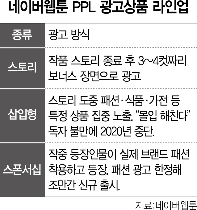 3. PPL 스폰서십은 지난 2020년 중단된 네이버웹툰 광고 ‘PPL 삽입형’의 자리를 대체할 전망이다. PPL 삽입형은 웹툰 스토리 전개 도중 일정 수의 컷(장면)을 할애해 패션, 식품, 가전 등 다양한 상품을 집중적으로 노출하는 일종의 중간 광고다. 영화·드라마로 치면 배우들이 특정 음식을 먹거나 가전을 사용하는 장면을 잠시 동안 자세히 보여주는 것이다. 하지만 스토리 몰입을 해친다는 독자 불만이 꾸준히 제기되자 네이버웹툰은 이 방식 광고를 중단했다. 이를 보완해 별도의 컷 할애 없이도 자연스럽게 상품을 노출하도록 만든 광고상품이 PPL 스폰서십이다.