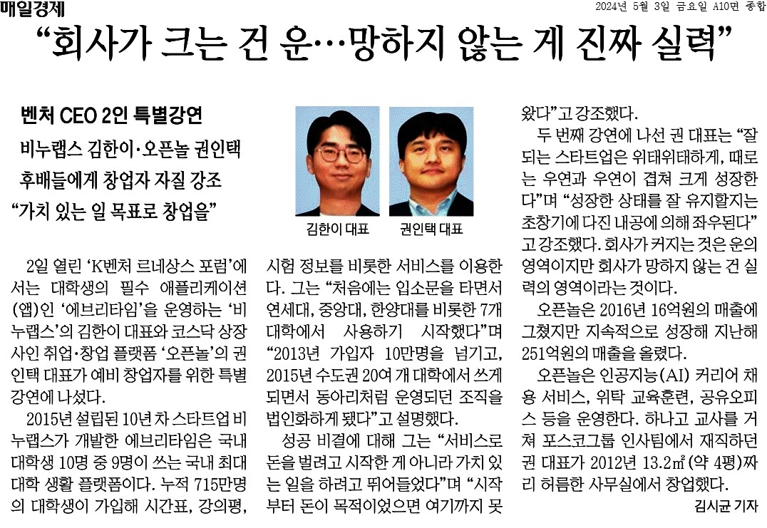 ② "처음에는 입소문을 타면서 연세대, 중앙대, 한양대를 비롯한 7개 대학에서 사용하기 시작했다"며 "2013년 가입자 10만명을 넘기고, 2015년 수도권 20여 개 대학에서 쓰게 되면서 동아리처럼 운영되던 조직을 법인화하게 됐다"