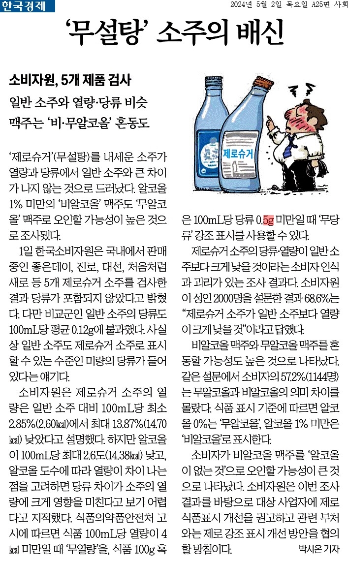 ① ‘제로슈거’(무설탕)를 내세운 소주가 열량과 당류에서 일반 소주와 큰 차이가 나지 않는 것으로 드러났다.