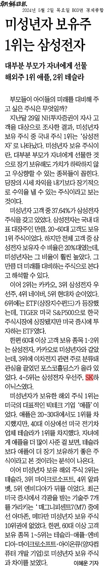① 지난달 29일 NH투자증권이 자사 고객을 대상으로 조사한 결과, 미성년자 보유 주식 중 국내 주식 1위는 ‘삼성전자’로 나타났다. 미성년자 보유 주식이란, 대부분 부모가 자녀에게 선물한 것으로 장기 보유해도 가치가 하락하지 않고 우상향할 수 있는 종목들이 꼽힌다. 당장의 시세 차익을 내기보다 장기적으로 수익을 낼 수 있는 주식이라고 보는 것이다.
