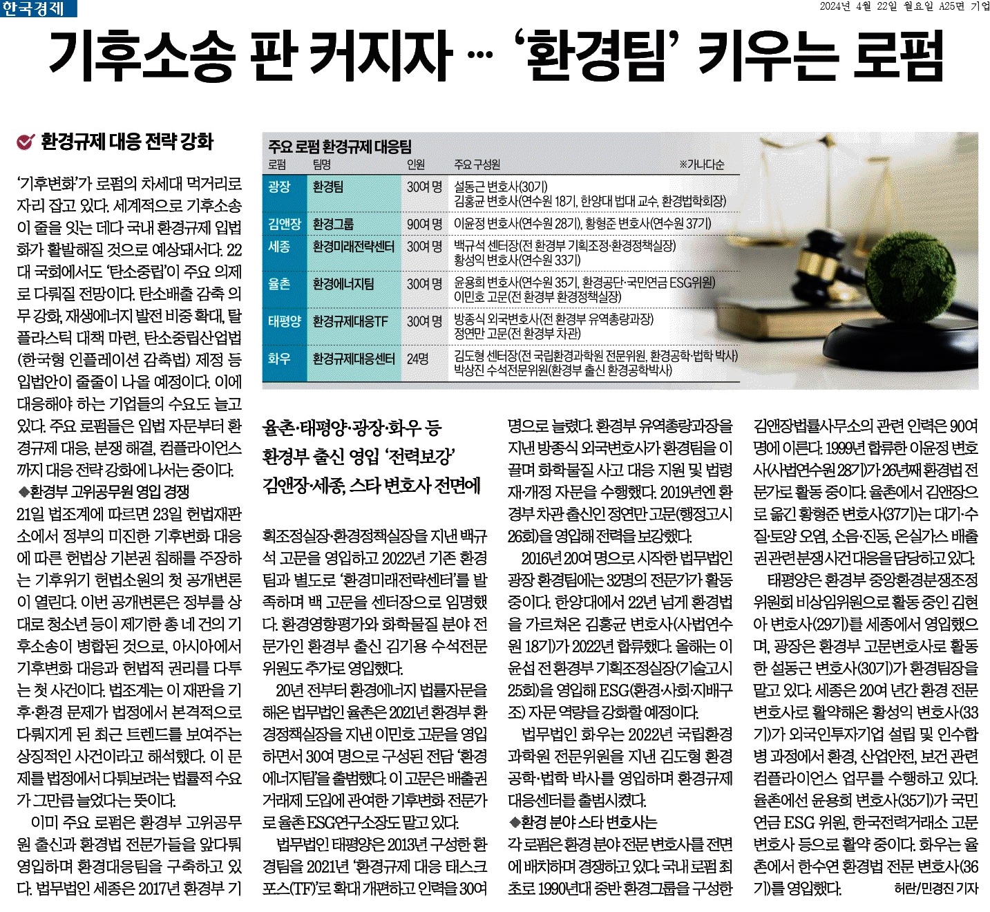 ① ‘기후변화’가 로펌의 차세대 먹거리로 자리 잡고 있다. 세계적으로 기후소송이 줄을 잇는 데다 국내 환경규제 입법화가 활발해질 것으로 예상돼서다. 22대 국회에서도 ‘탄소중립’이 주요 의제로 다뤄질 전망이다.