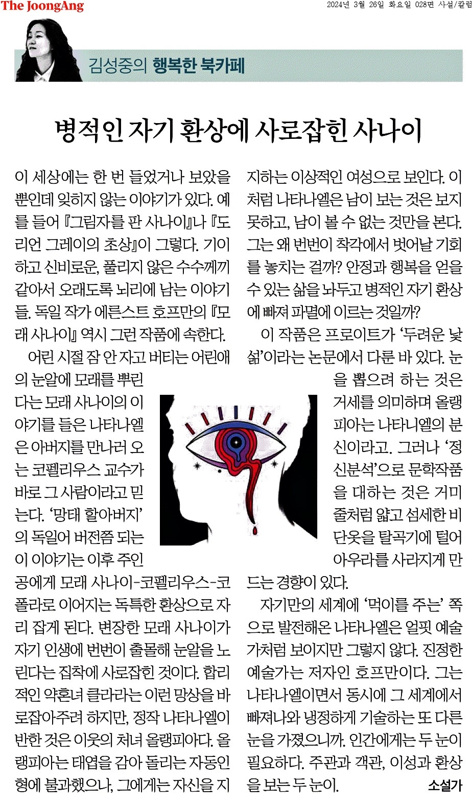 ⑤ 자기만의 세계에 ‘먹이를 주는’ 쪽으로 발전해온 나타나엘은 얼핏 예술가처럼 보이지만 그렇지 않다. 진정한 예술가는 저자인 호프만이다. 그는 나타나엘이면서 동시에 그 세계에서 빠져나와 냉정하게 기술하는 또 다른 눈을 가졌으니까. 인간에게는 두 눈이 필요하다. 주관과 객관, 이성과 환상을 보는 두 눈이.