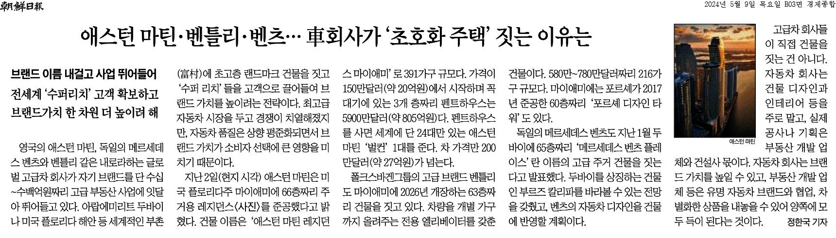 ① 영국의 애스턴 마틴, 독일의 메르세데스 벤츠와 벤틀리 같은 내로라하는 글로벌 고급차 회사가 자기 브랜드를 단 수십~수백억원짜리 고급 부동산 사업에 잇달아 뛰어들고 있다.