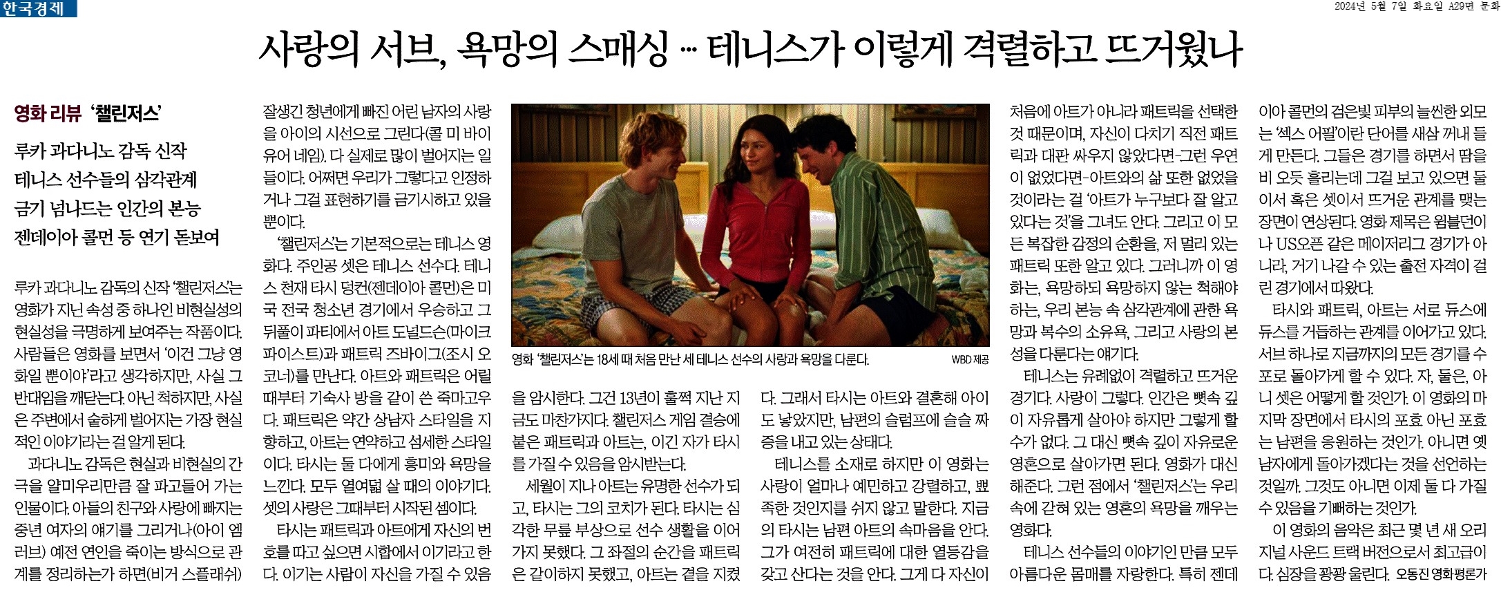 ① 루카 과다니노 감독의 신작 ‘챌린저스’는 영화가 지닌 속성 중 하나인 비현실성의 현실성을 극명하게 보여주는 작품이다. 사람들은 영화를 보면서 ‘이건 그냥 영화일 뿐이야’라고 생각하지만, 사실 그 반대임을 깨닫는다. 아닌 척하지만, 사실은 주변에서 숱하게 벌어지는 가장 현실적인 이야기라는 걸 알게 된다.