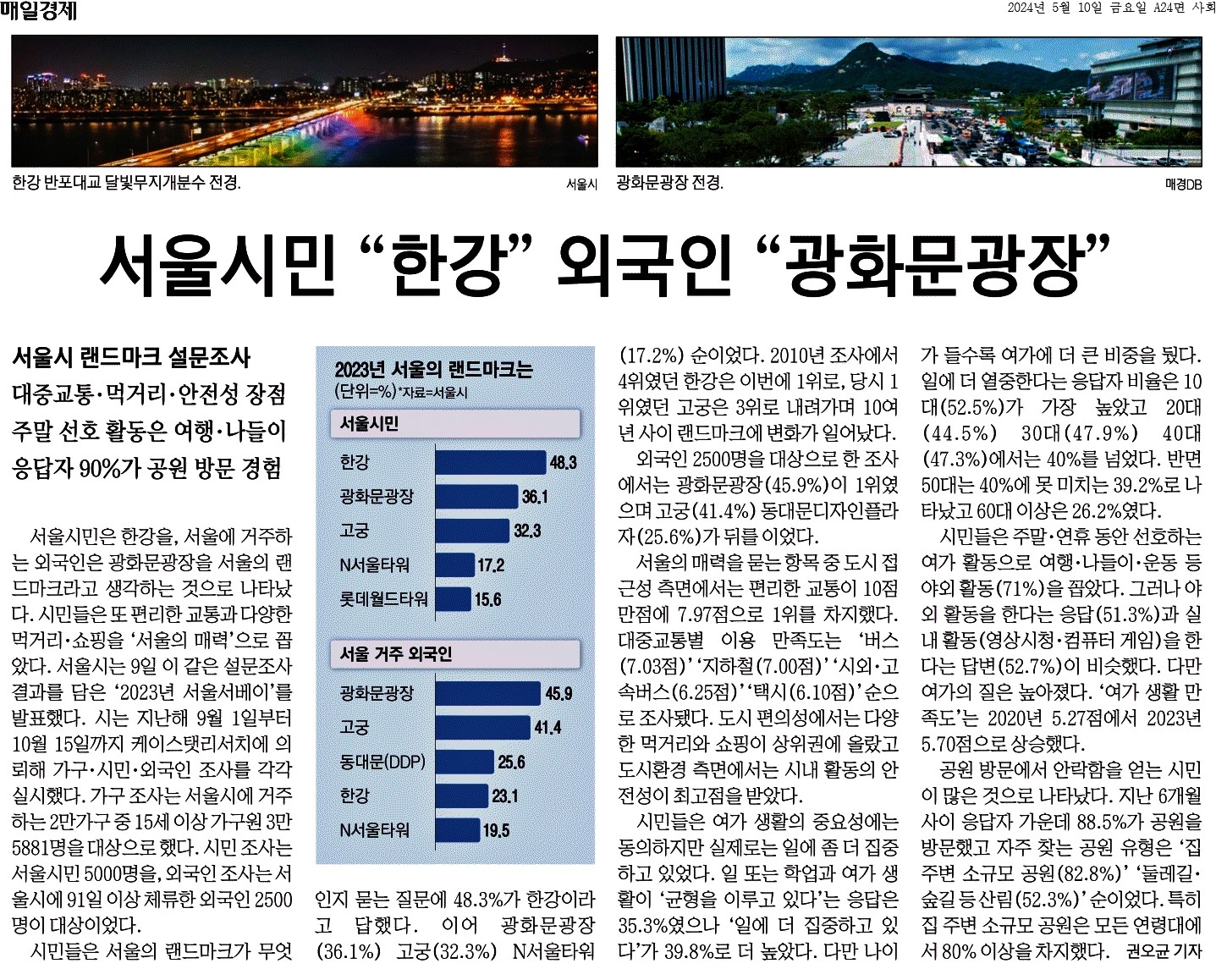 ① 서울시민은 한강을, 서울에 거주하는 외국인은 광화문광장을 서울의 랜드마크라고 생각하는 것으로 나타났다. 시민들은 또 편리한 교통과 다양한 먹거리·쇼핑을 '서울의 매력'으로 꼽았다.