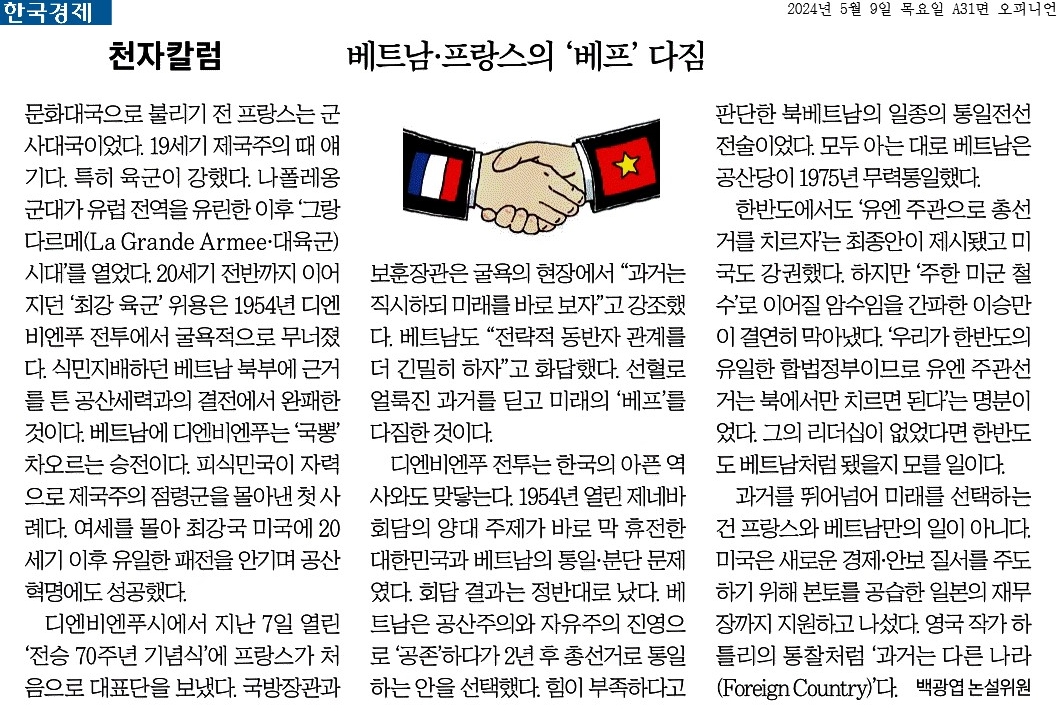 ⑤ 과거를 뛰어넘어 미래를 선택하는 건 프랑스와 베트남만의 일이 아니다. 미국은 새로운 경제·안보 질서를 주도하기 위해 본토를 공습한 일본의 재무장까지 지원하고 나섰다. 영국 작가 하틀리의 통찰처럼 ‘과거는 다른 나라(Foreign Country)’다.