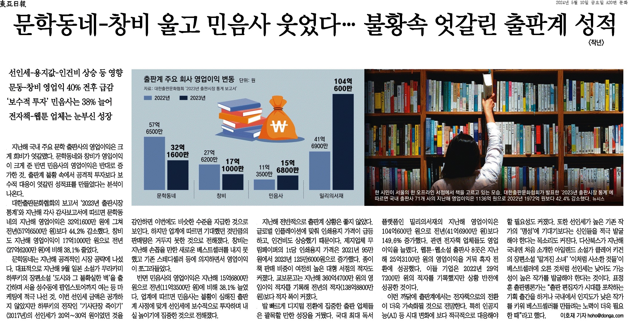 ① 문학동네와 창비가 영입이익이 크게 준 반면 민음사의 영업이익은 반대로 증가한 것. 출판계 불황 속에서 공격적 투자보다 보수적 대응이 엇갈린 성적표를 만들었다는 분석이 나온다.
