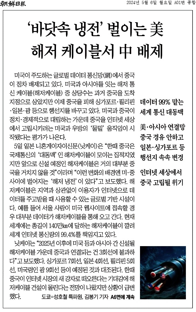 ② “한때 중국은 국제통신의 ‘대동맥’인 해저케이블이 모이는 집적지였지만 앞으로 신설 예정인 해저케이블은 거의 대부분 중국을 거치지 않을 것”이라며 “이런 변화의 배경엔 미·중 사이에 벌어지는 ‘해저 냉전’이 있다”