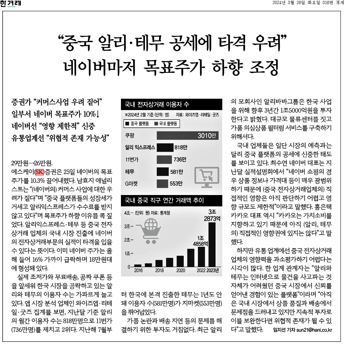 ① 알리익스프레스·테무 등 중국 전자상거래 업체의 국내 시장 진출에 네이버의 전자상거래부문의 실적이 타격을 입을 수 있다는 뜻이다.