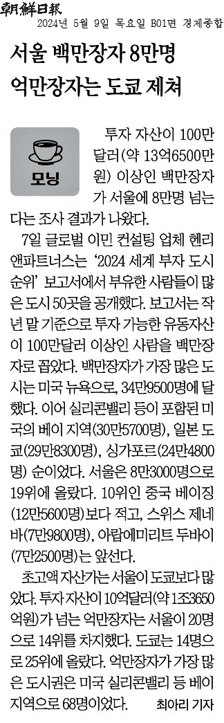 ① 서울에 자산이 100만달러(약13억6000만원)가 넘는 백만장자가 8만명이 넘는다는 조사 결과가 나왔다. 자산이 10억달러(약1조3650억원)가 넘는 억만장자는 서울이 일본 도쿄보다도 많았다.