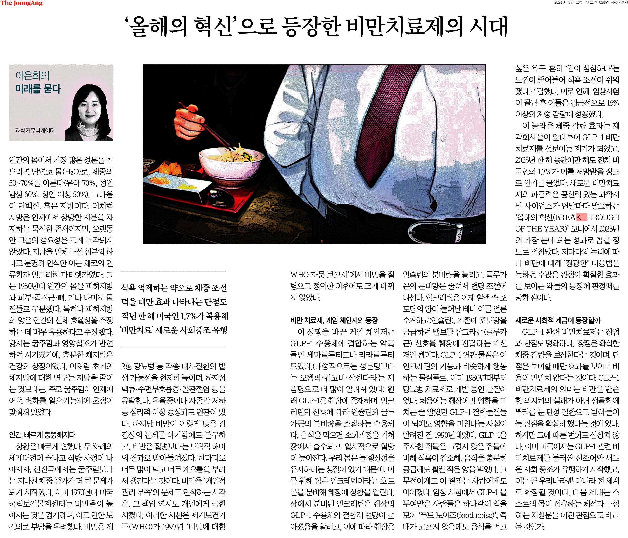 ④ 새로운 비만치료제의 파급력은 공신력 있는 과학저널 사이언스가 연말마다 발표하는 ‘올해의 혁신(BREAKTHROUGH OF THE YEAR)’ 코너에서 2023년의 가장 눈에 띄는 성과로 꼽을 정도로 엄청났다.