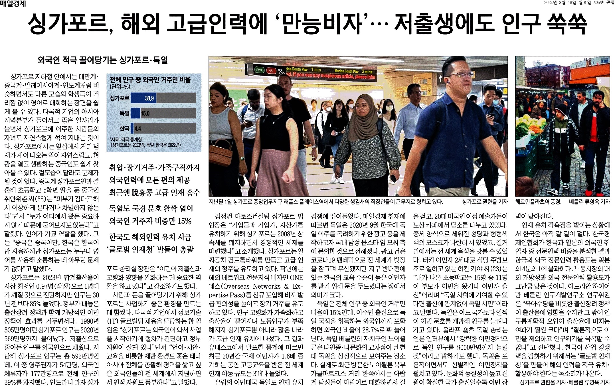 ④ 지난해 싱가포르 인구는 총 592만명인데, 이 중 영주권자가 54만명, 외국인 체류자가 177만명으로 전체 인구의 39%를 차지했다. 인드라니 라자 싱가포르 총리실 장관은 "이민이 저출산과 고령화 영향을 완화하는 데 중요한 역할을 하고 있다"고 강조하기도 했다.