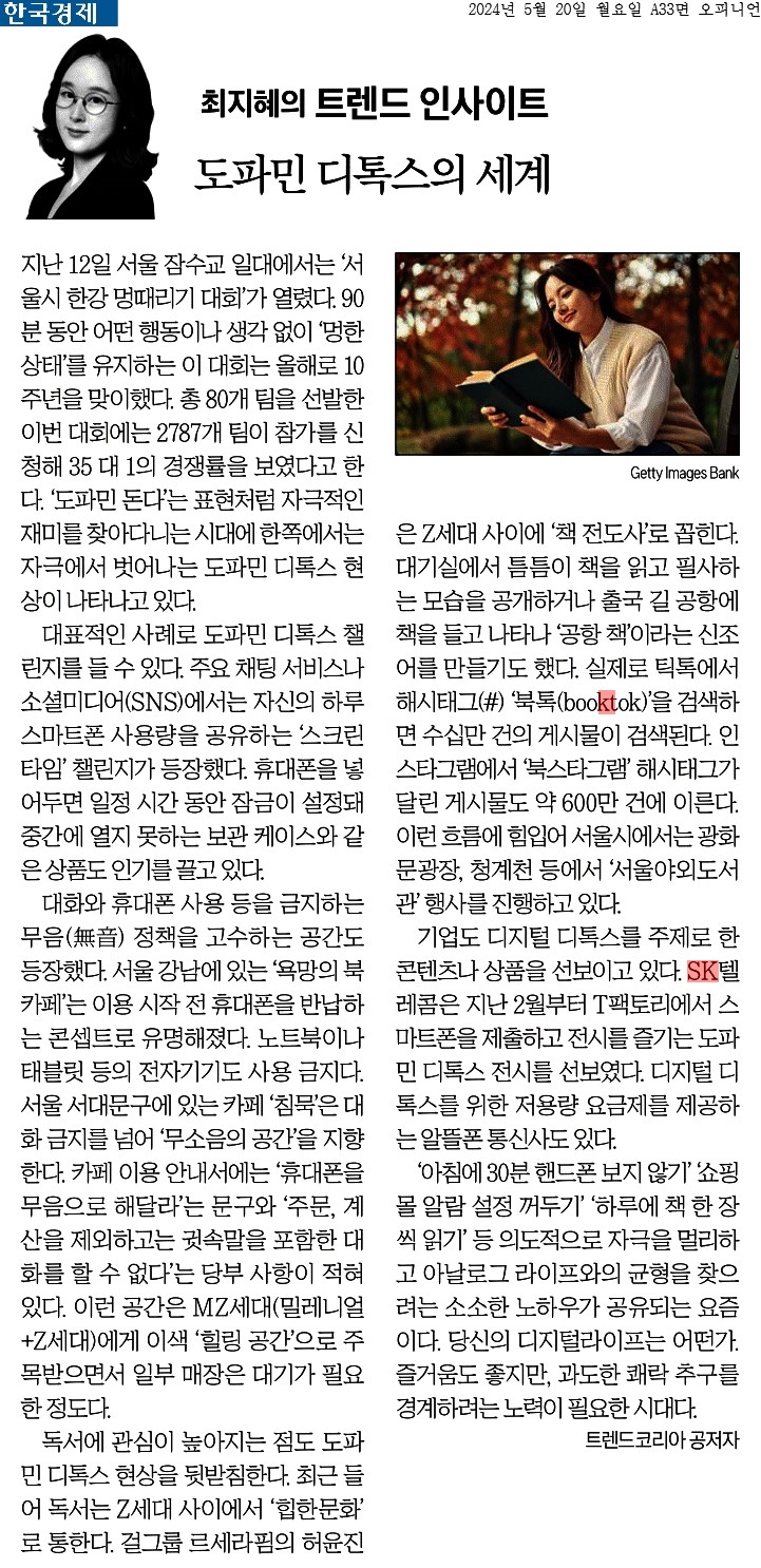 ④ 독서에 관심이 높아지는 점도 도파민 디톡스 현상을 뒷받침한다. 최근 들어 독서는 Z세대 사이에서 ‘힙한문화’로 통한다. 걸그룹 르세라핌의 허윤진은 Z세대 사이에 ‘책 전도사’로 꼽힌다.