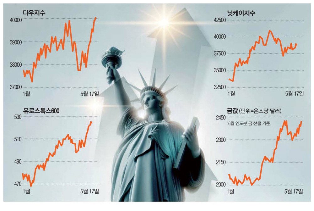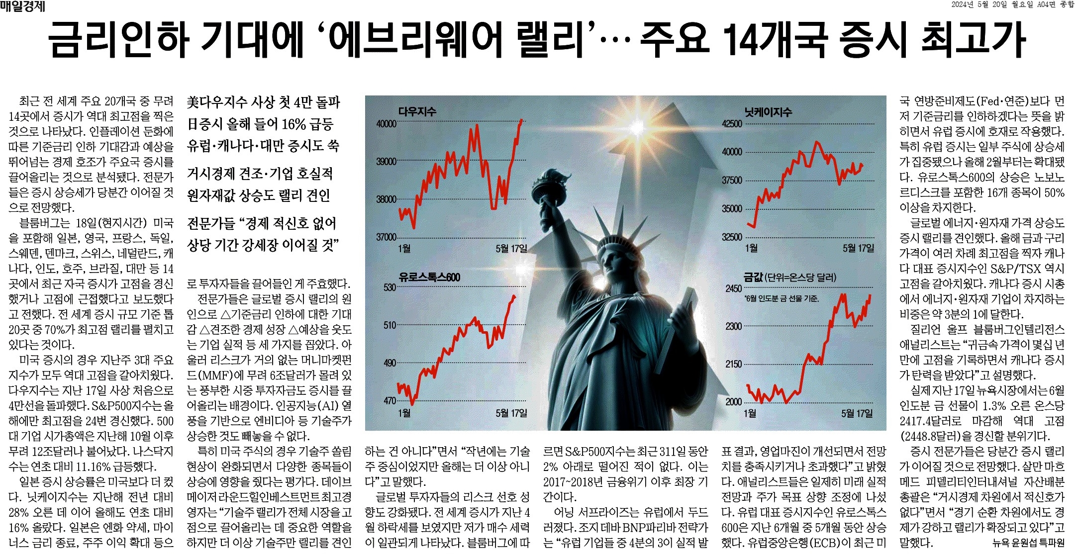 ① 최근 전 세계 주요 20개국 중 무려 14곳에서 증시가 역대 최고점을 찍은 것으로 나타났다. 인플레이션 둔화에 따른 기준금리 인하 기대감과 예상을 뛰어넘는 경제 호조가 주요국 증시를 끌어올리는 것으로 분석됐다.