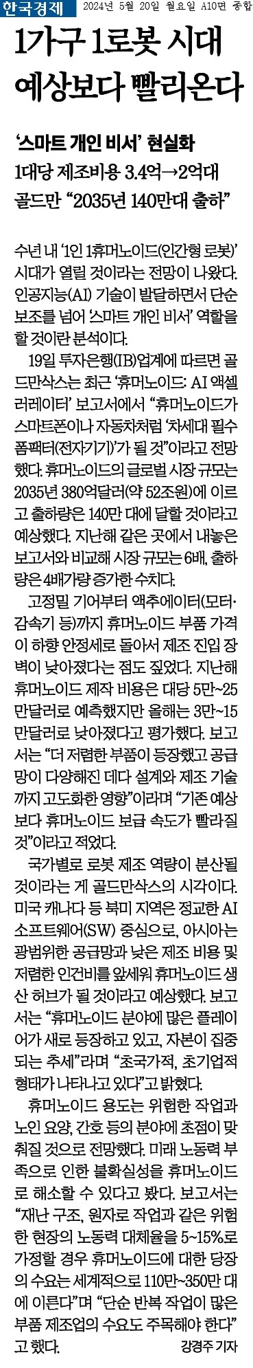① 수년 내 ‘1인 1휴머노이드(인간형 로봇)’ 시대가 열릴 것이라는 전망이 나왔다. 인공지능(AI) 기술이 발달하면서 단순 보조를 넘어 ‘스마트 개인 비서’ 역할을 할 것이란 분석이다.