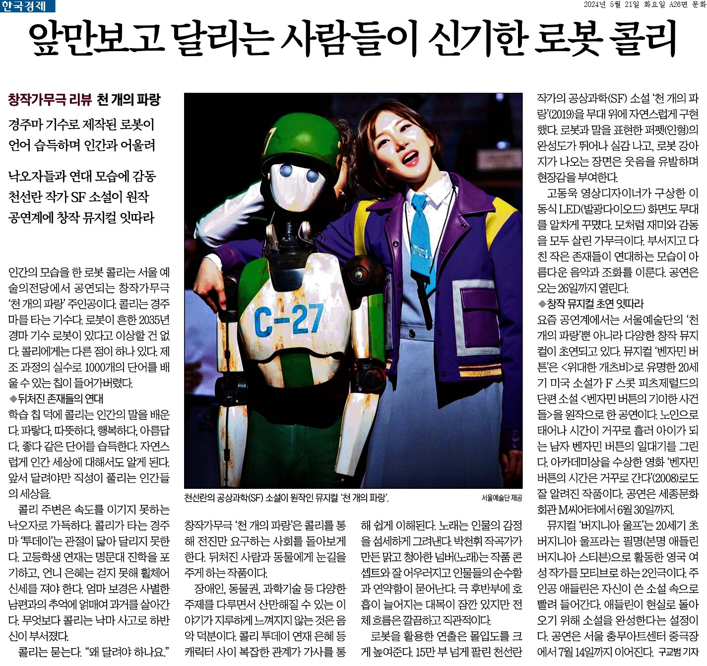 ⑤ 로봇을 활용한 연출은 몰입도를 크게 높여준다. 15만 부 넘게 팔린 천선란 작가의 공상과학(SF) 소설 ‘천 개의 파랑’(2019)을 무대 위에 자연스럽게 구현했다.