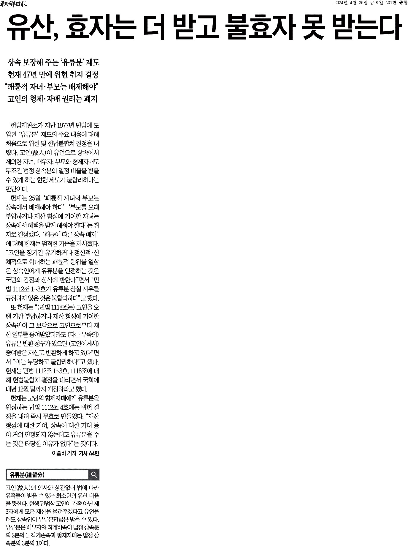 ① 헌법재판소가 지난 1977년 민법에 도입된 ‘유류분’ 제도의 주요 내용에 대해 처음으로 위헌 및 헌법불합치 결정을 내렸다. 고인(故人)이 유언으로 상속에서 제외한 자녀, 배우자, 부모와 형제자매도 무조건 법정 상속분의 일정 비율을 받을 수 있게 하는 현행 제도가 불합리하다는 판단이다.