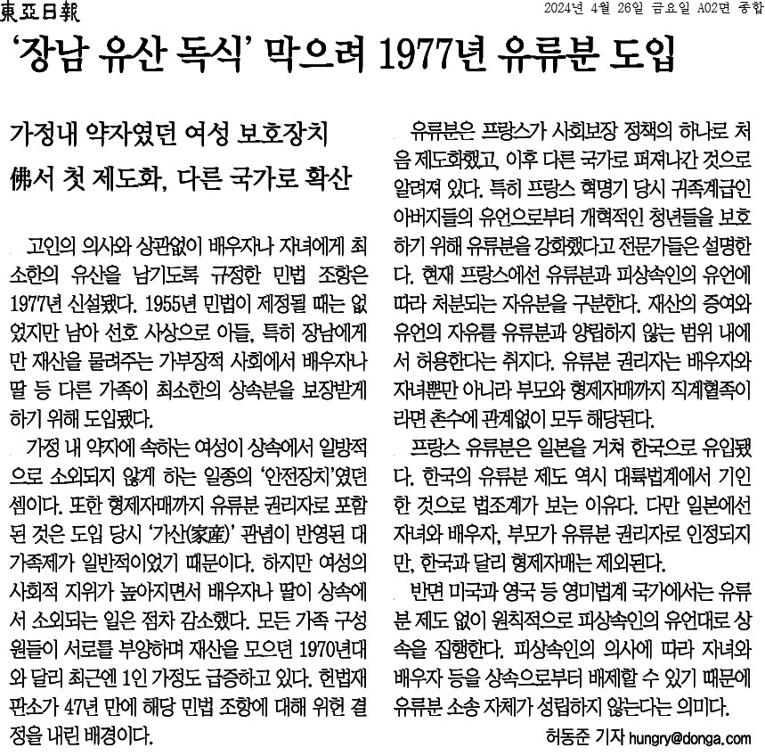 ① 고인의 의사와 상관없이 배우자나 자녀에게 최소한의 유산을 남기도록 규정한 민법 조항은 1977년 신설됐다. 1955년 민법이 제정될 때는 없었지만 남아 선호 사상으로 아들, 특히 장남에게만 재산을 물려주는 가부장적 사회에서 배우자나 딸 등 다른 가족이 최소한의 상속분을 보장받게 하기 위해 도입됐다.