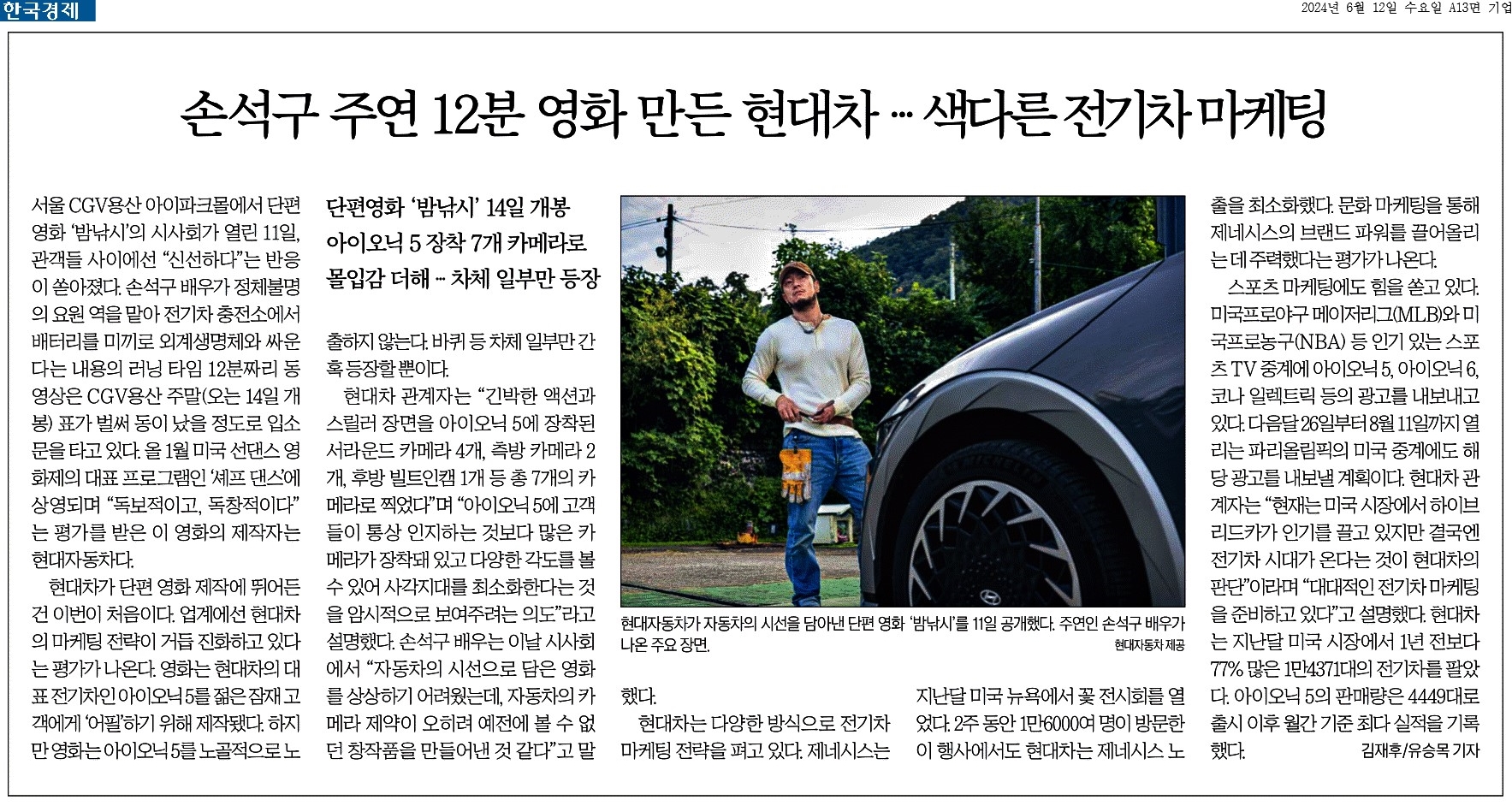 ③ 현대차가 단편 영화 제작에 뛰어든 건 이번이 처음이다. 업계에선 현대차의 마케팅 전략이 거듭 진화하고 있다는 평가가 나온다. 영화는 현대차의 대표 전기차인 아이오닉 5를 젊은 잠재 고객에게 ‘어필’하기 위해 제작됐다.