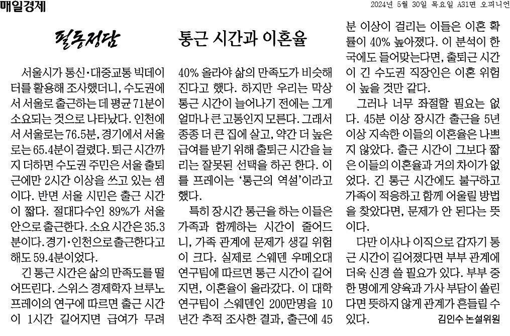 ③ 특히 장시간 통근을 하는 이들은 가족과 함께하는 시간이 줄어드니, 가족 관계에 문제가 생길 위험이 크다. 실제로 스웨덴 우메오대 연구팀에 따르면 통근 시간이 길어지면, 이혼율이 올라갔다.