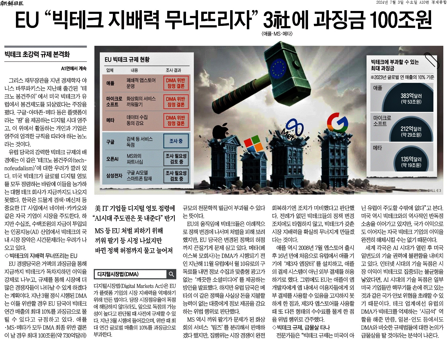 ③ EU 경쟁당국은 거액의 과징금을 통해 지금까지 빅테크가 독차지하던 이익을 강제로 나누고, 규제를 통해 시장에 더 많은 경쟁자들이 나타날 수 있게 하겠다는 계획이다.