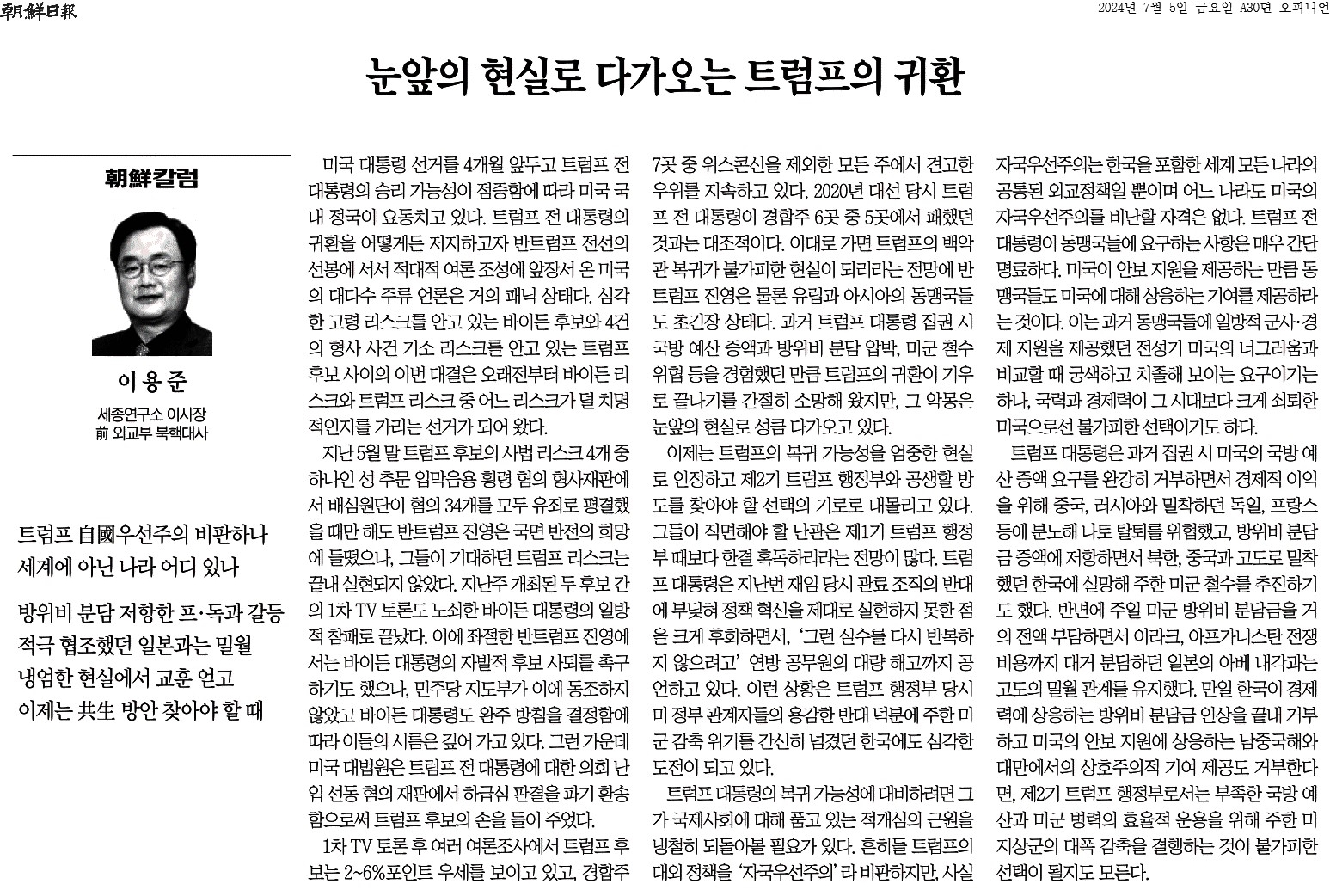 ① 미국 대통령 선거를 4개월 앞두고 트럼프 전 대통령의 승리 가능성이 점증함에 따라 미국 국내 정국이 요동치고 있다. 트럼프 전 대통령의 귀환을 어떻게든 저지하고자 반트럼프 전선의 선봉에 서서 적대적 여론 조성에 앞장서 온 미국의 대다수 주류 언론은 거의 패닉 상태다.