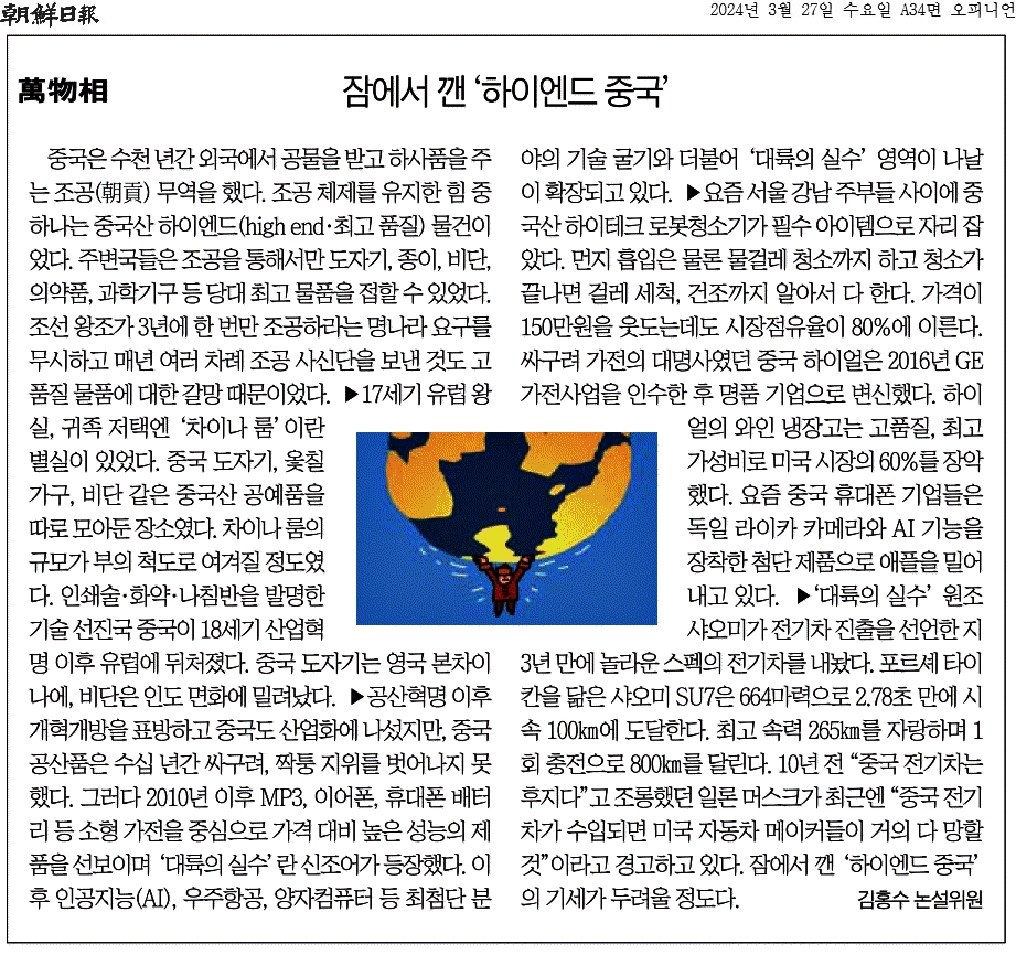 ① 중국은 수천 년간 외국에서 공물을 받고 하사품을 주는 조공(朝貢) 무역을 했다. 조공 체제를 유지한 힘 중 하나는 중국산 하이엔드(high end·최고 품질) 물건이었다. 주변국들은 조공을 통해서만 도자기, 종이, 비단, 의약품, 과학기구 등 당대 최고 물품을 접할 수 있었다.