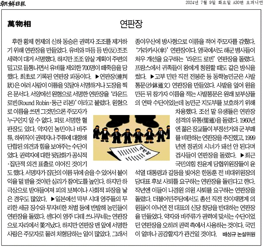 ② 연판장(連判狀)은 여러 사람이 이름을 잇달아 서명하거나 도장을 찍은 문서다. 서양에선 원형으로 서명한 연판장을 ‘라운드 로빈(Round Robin·둥근 리본)’이라고 불렀다. 원형으로 이름을 쓰면 그것만으론 주모자가 누구인지 알 수 없다.