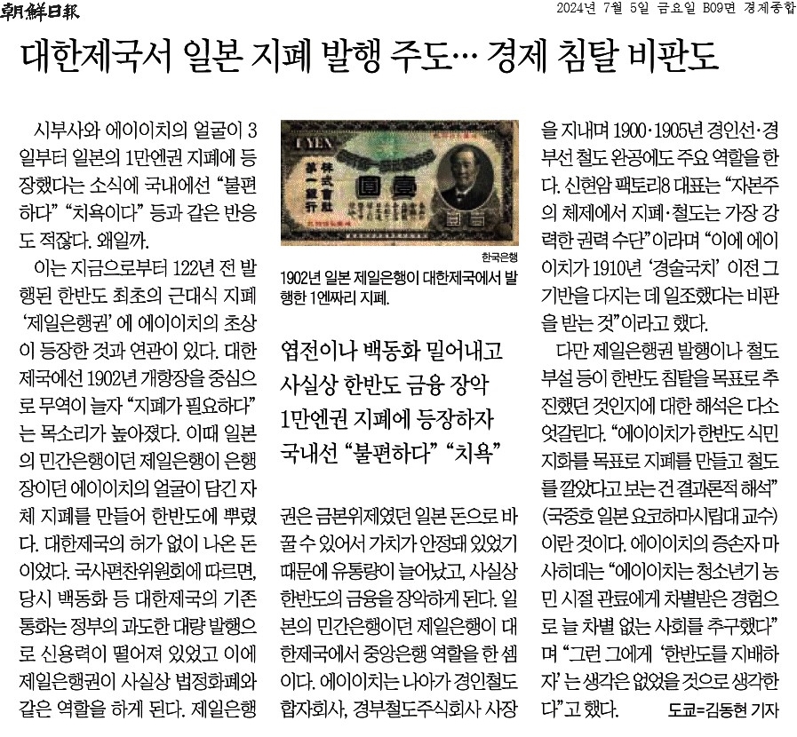 ② 대한제국에선 1902년 개항장을 중심으로 무역이 늘자 “지폐가 필요하다”는 목소리가 높아졌다. 이때 일본의 민간은행이던 제일은행이 은행장이던 에이이치의 얼굴이 담긴 자체 지폐를 만들어 한반도에 뿌렸다. 대한제국의 허가 없이 나온 돈이었다.