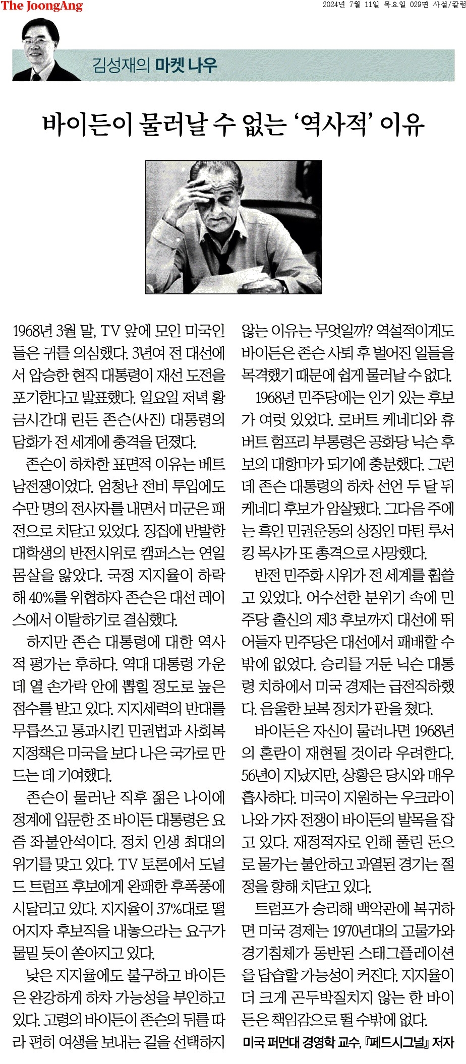④ 바이든은 자신이 물러나면 1968년의 혼란이 재현될 것이라 우려한다. 56년이 지났지만, 상황은 당시와 매우 흡사하다. 미국이 지원하는 우크라이나와 가자 전쟁이 바이든의 발목을 잡고 있다. 재정적자로 인해 풀린 돈으로 물가는 불안하고 과열된 경기는 절정을 향해 치닫고 있다.