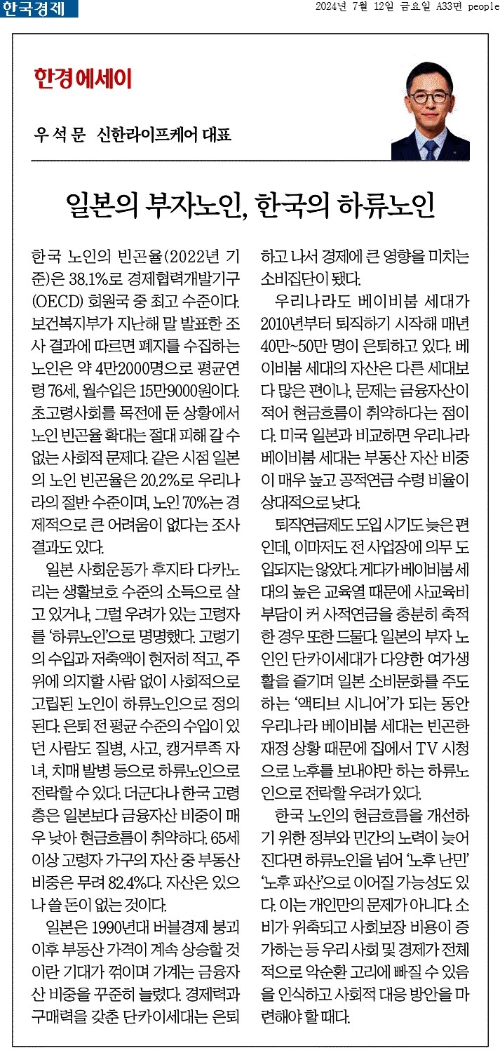 ② 초고령사회를 목전에 둔 상황에서 노인 빈곤율 확대는 절대 피해 갈 수 없는 사회적 문제다. 같은 시점 일본의 노인 빈곤율은 20.2%로 우리나라의 절반 수준이며, 노인 70%는 경제적으로 큰 어려움이 없다는 조사 결과도 있다.