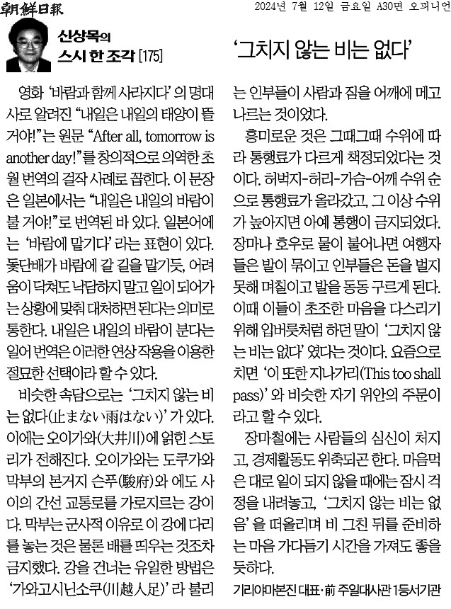 ⑤ 이때 이들이 초조한 마음을 다스리기 위해 입버릇처럼 하던 말이 ‘그치지 않는 비는 없다’였다는 것이다. 요즘으로 치면 ‘이 또한 지나가리(This too shall pass)’와 비슷한 자기 위안의 주문이라고 할 수 있다.